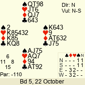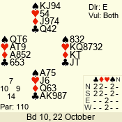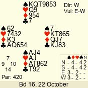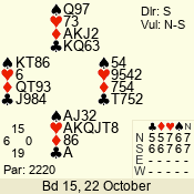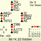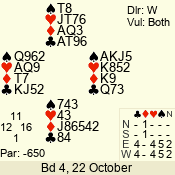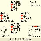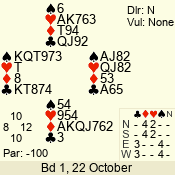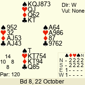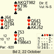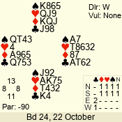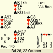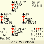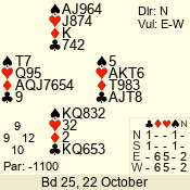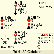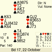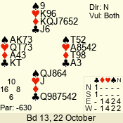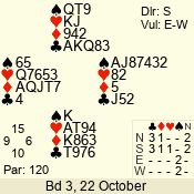 | Con | Dc | Res | Score | Ld | Pairs | Rd | Tbl | | 3 N | S | = | 400 | 3 | 03 - 11 | 8 | 10 |