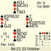 | Con | Dc | Res | Score | Ld | Pairs | Rd | Tbl | | 3 N | S | +1 | 430 | 7 | 01 - 05 | 12 | 5 |