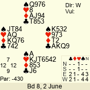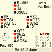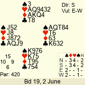 | Con | Dc | Res | Score | Ld | Pairs | Rd | Tbl | | 3 N | S | +4 | 520 | 7 | 01 - 09 | 13 | 4 |