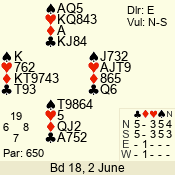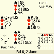 | Con | Dc | Res | Score | Ld | Pairs | Rd | Tbl | | 3 N | S | = | 600 | 7 | 01 - 11 | 7 | 3 |