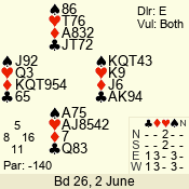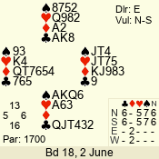 | Con | Dc | Res | Score | Ld | Pairs | Rd | Tbl | | 3 N | E | -2 | 200 | 7 | 18 - 02 | 2 | 1 |