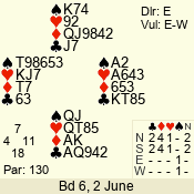 | Con | Dc | Res | Score | Ld | Pairs | Rd | Tbl | | 3 N | E | -4 | 200 | T | 16 - 02 | 9 | 6 |